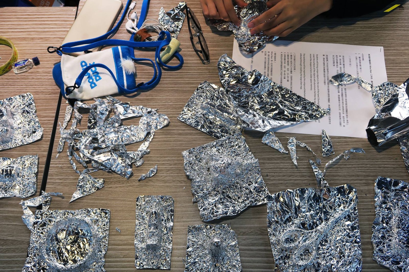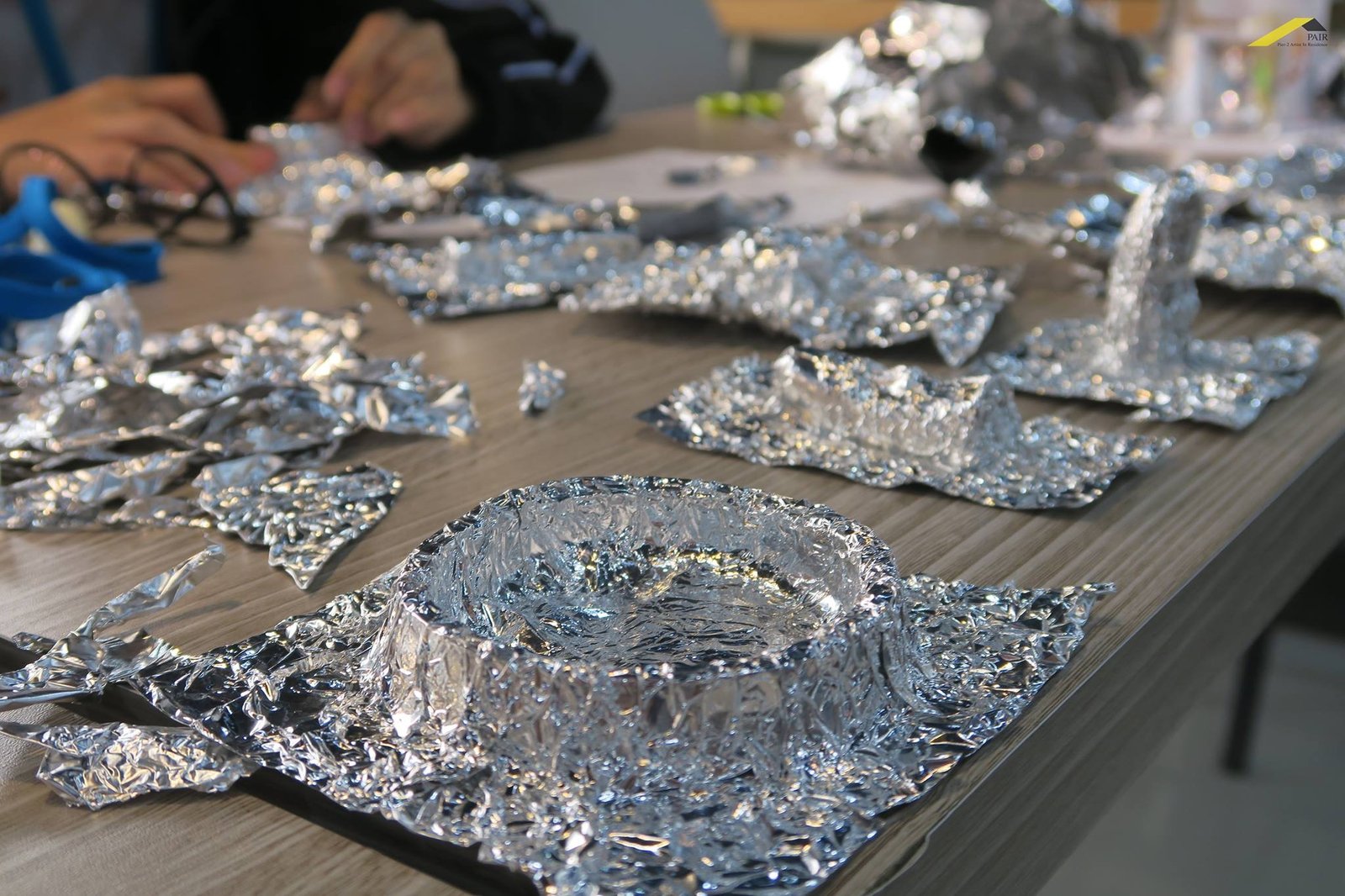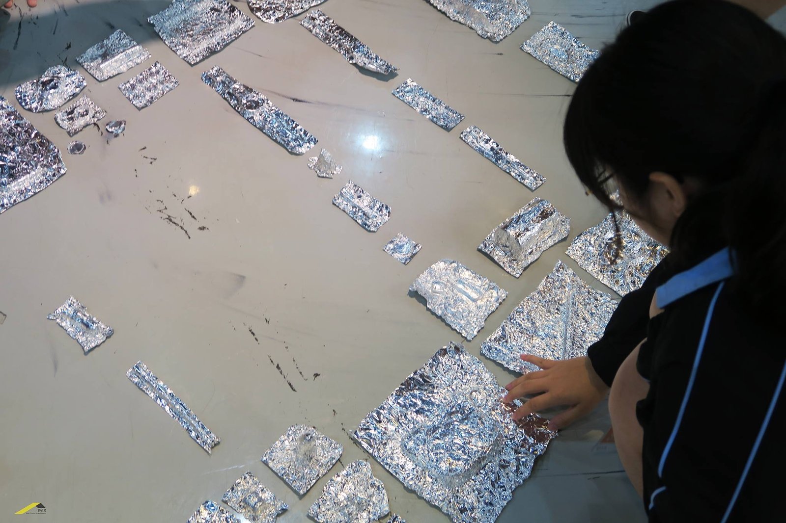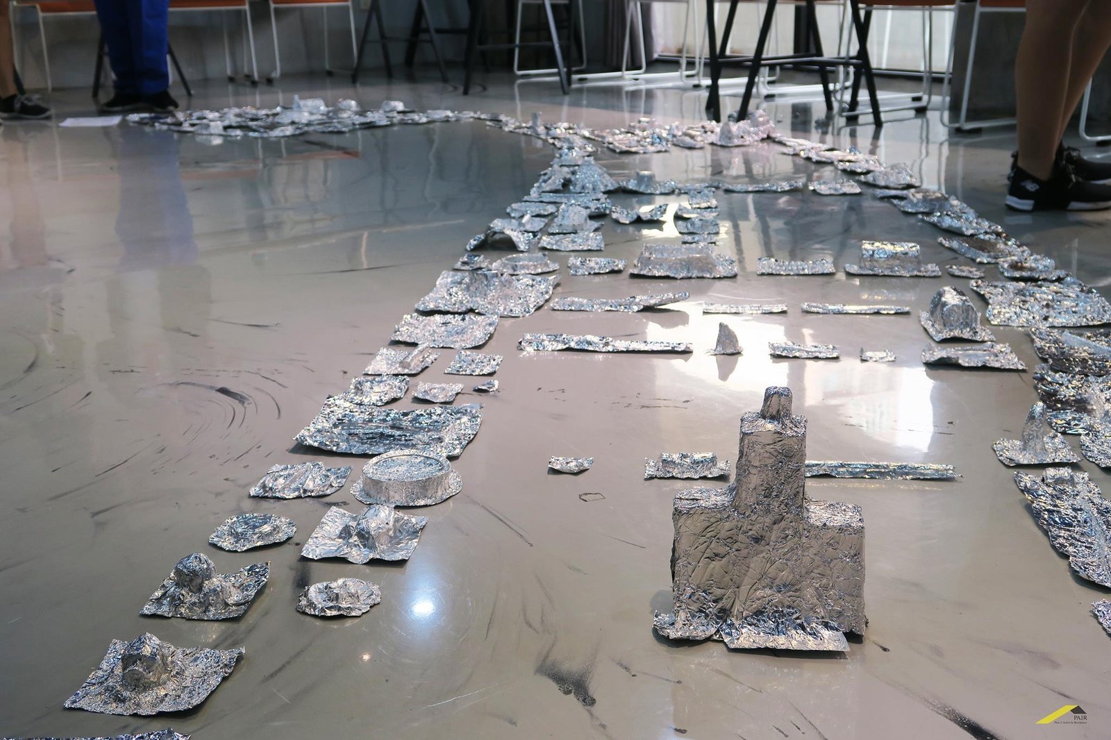 A collaborative project inspired by the unique architecture of Kaohsiung city which is reflected through a contemporary way by installing a map of silver paper. Local children encouraged to bring tools representing important aspects of their cultural heritage. During the workshop, they covered the surfaces of the tools with aluminum foil by applying pressure and through drawing, they record the shapes to form visible space memory. Paper formations are tied together while we communicate with each other. The silver color symbolizes the diverse cultural richness that reflects a picture of connection and development towards the future.